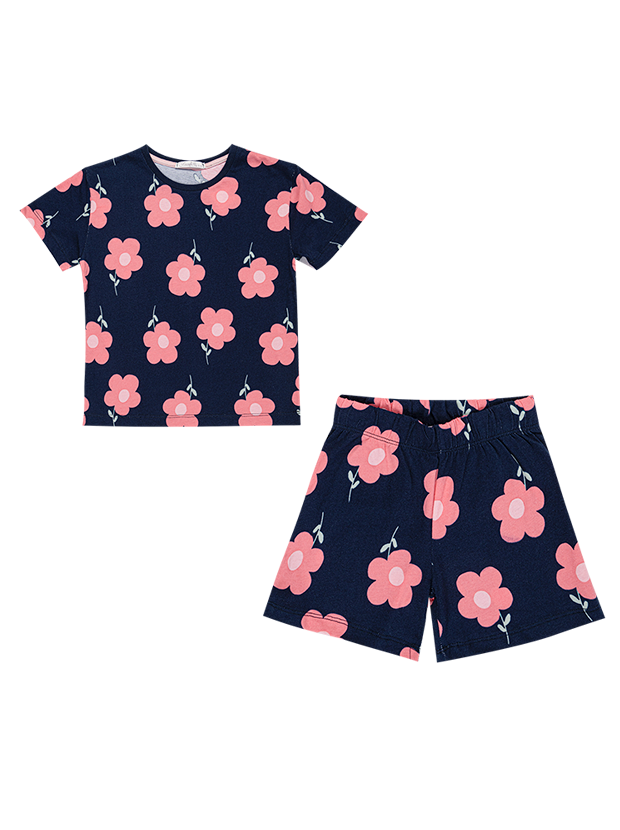 تیشرت و شلوارک دخترانه مدل گل صورتی و سرمه ای